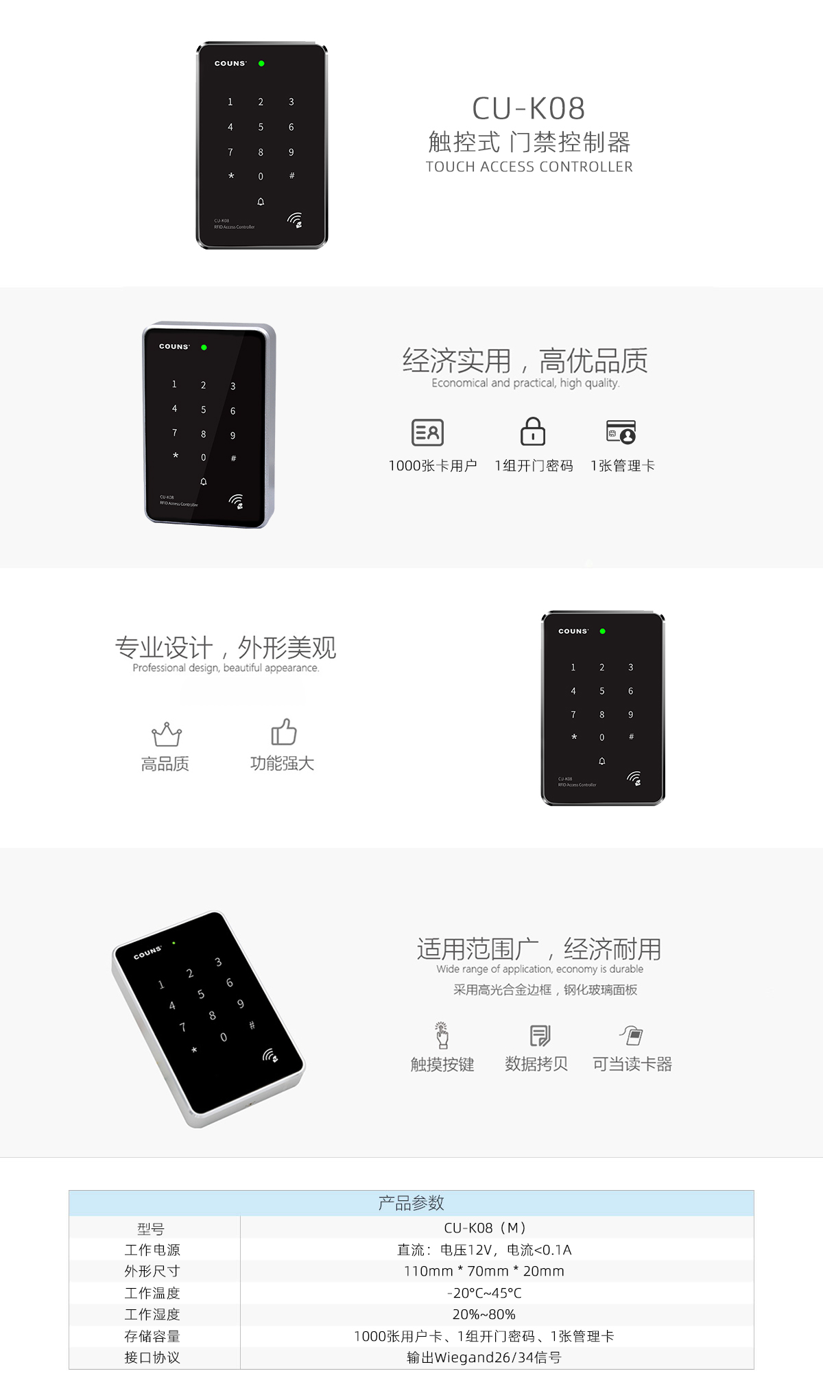 * 1000张卡用户,1组开门密码,1张管理卡。